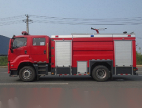 江特牌JDF5172GXFSG60/Q6型水罐消防車采用慶鈴QL1180EQFRY底盤改裝而成。整車由消防員乘員室和車身兩大部分組成,乘員室為單排改雙排,可乘坐2+3人,該車為外露罐結(jié)構(gòu),車身前部為器材箱,中部為罐體,后部為泵房。載液罐體為優(yōu)質(zhì)碳鋼,內(nèi)部噴涂環(huán)氧底漆及環(huán)氧瀝青漆,與底盤采用彈性連接,載水6300kg,裝備了上海茸申消防設(shè)備有限公司生產(chǎn)CB10/40-RS型常壓消防泵,額定流量40L/S,車頂安裝成都威斯特消防機(jī)械有限公司生產(chǎn)的PS8/40W型車用消防炮。該車最大的特點是載液量大、操控性好、維修簡便??蓮V泛應(yīng)用于公安消防隊、廠礦企業(yè)及社區(qū)、碼頭等場所,撲救大型油類火災(zāi)和一般物質(zhì)火災(zāi)。