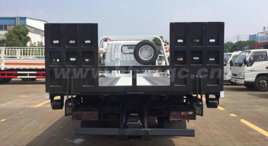 采用德國技術(shù)折疊沖壓式平板,平板長4.2米,寬2.3米,雙側(cè)聯(lián)動操作裝置,配后工作燈2只,一個4噸液壓絞盤,帶25米鋼絲繩,一個工具箱,配2個小車,4根捆綁帶, L型抱胎架一對,加液壓伸縮式輔助板,使平板長度增加到5.4米,