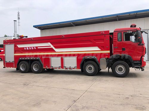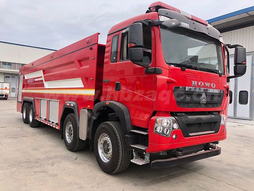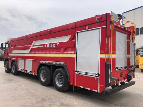 江特牌JDF5420GXFSG240/Z6型水罐消防車采用重汽豪沃ZZ5447TXFV466MF1底盤改裝而成。整車由消防員乘員室和車身兩大部分組成,乘員室為原裝單排,可乘坐2人,該車為外露罐結(jié)構(gòu),中部為罐體,后部為泵房。載液罐體為優(yōu)質(zhì)碳鋼,內(nèi)部噴涂環(huán)氧底漆及環(huán)氧瀝青漆,與底盤采用彈性連接,載水量24000kg,裝備了上海茸申消防設(shè)備有限公司生產(chǎn)CB10/80-1RS型常壓消防泵,額定流量80L/S,車頂安裝成都威斯特消防機械有限公司生產(chǎn)的PS8/80W型車用消防炮。該車最大的特點是載液量大、操控性好、維修簡便。可廣泛應(yīng)用于公安消防隊、廠礦企業(yè)及社區(qū)、碼頭等場所,撲救大型油類火災(zāi)和一般物質(zhì)火災(zāi)。